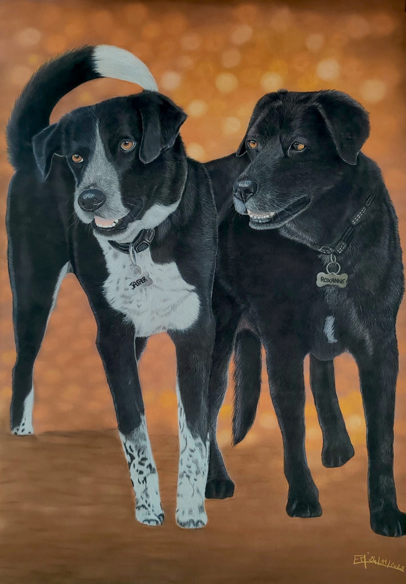 « J’ai découvert le travail d’Erell lors d’une exposition en Bretagne alors que mon Jasper avait déjà rejoint les étoiles et que ma Roxanne était en fin de vie. En échangeant avec Erell, une idée folle m’est venue : immortaliser mes chiens dans une représentation au plus proche de qui ils étaient ! Erell a accepté le défi. Je ne disposais pas de photos de mes chiens posant ensemble dans l’attitude que je voulais retrouver chez eux mais pour Erell ce n’était pas un problème ! Sur la base de 5 photos elle a réussi à relever le défi haut la main ! J’ai maintenant une superbe reproduction de Jaspouille la Fripouille et Roxanne la Force Tranquille, ensemble et regardant dans la même direction ! Merci avec un grand M, Erell, et ce, même si tu m’as fait pleurer lorsque j’ai découvert ton travail magnifique ! »